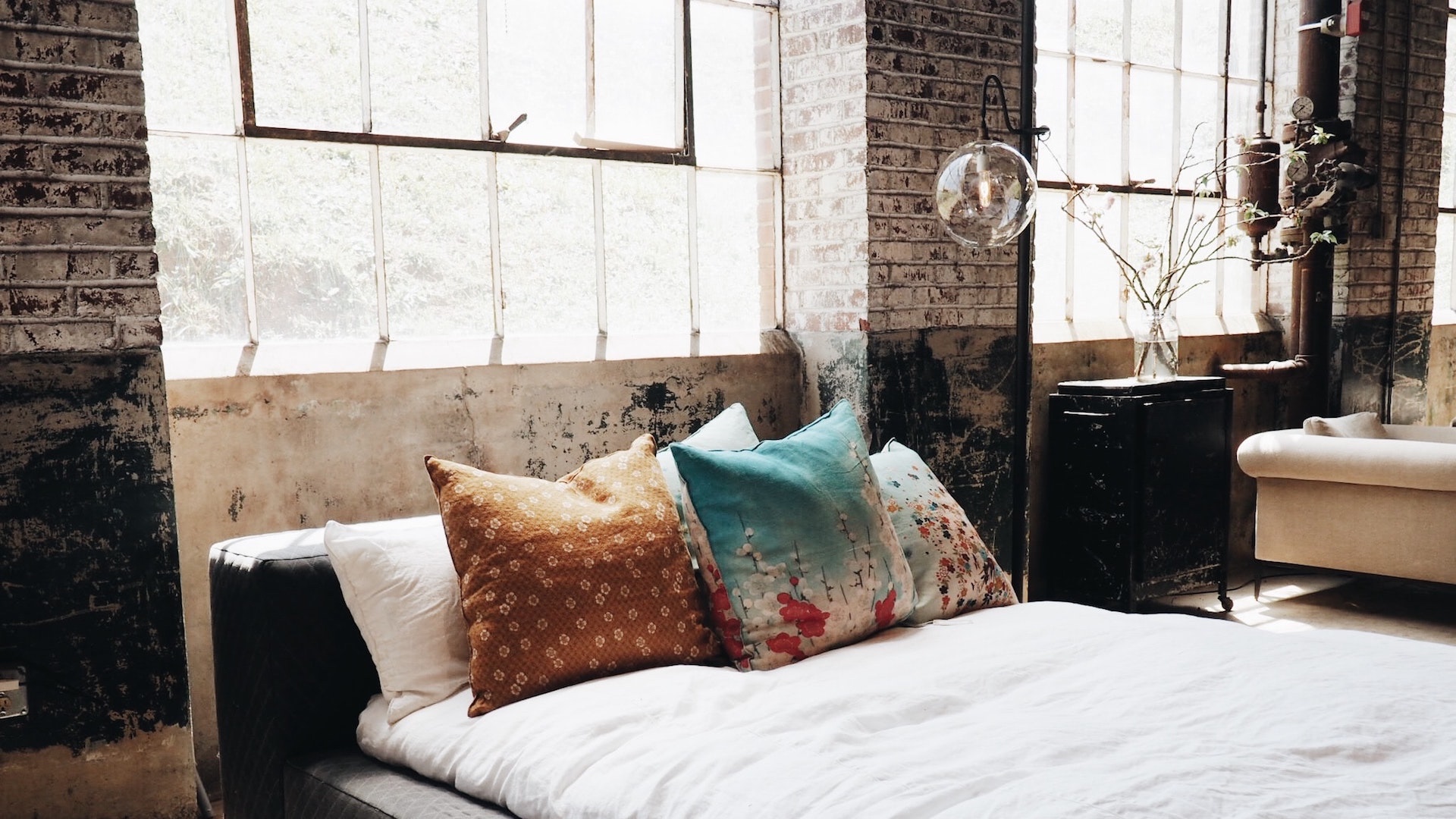 | PC用 大きな窓とベッドとクッションのある部屋の素材 |