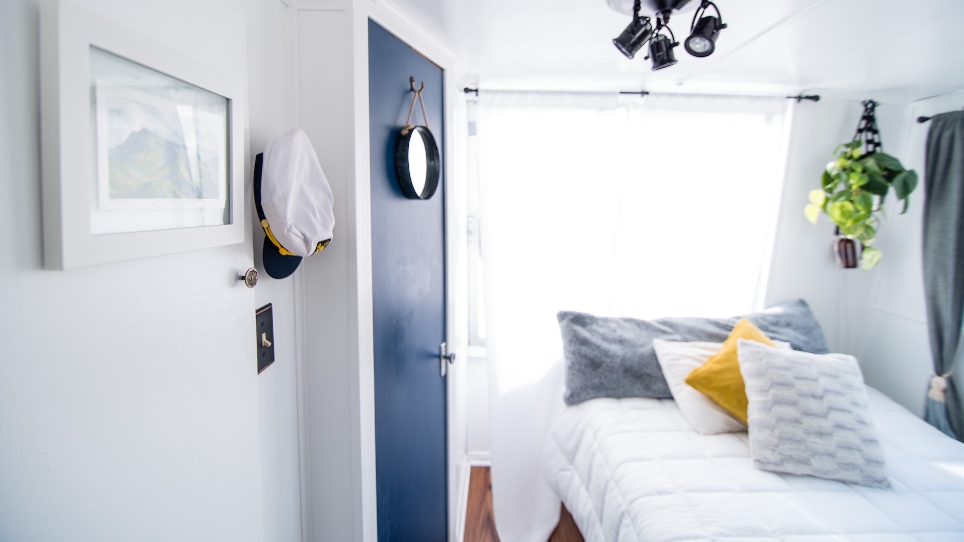 青いドアとベッドのある部屋 部屋のバーチャル背景 2020.08.12 Photo by manny PANTOJA on Unsplash Download Now! PC用 青いドアとベッドのある部屋の素材