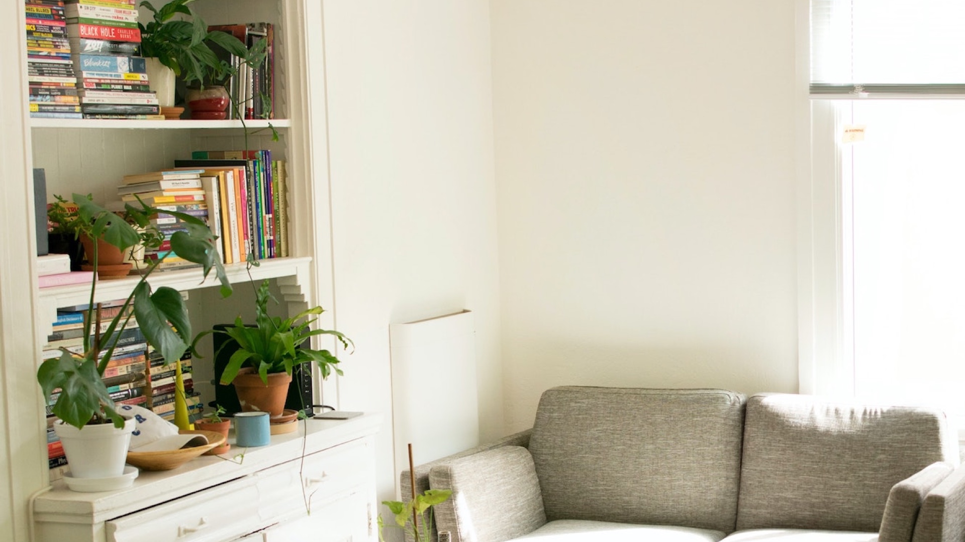 本棚と観葉植物とソファーのある部屋 部屋のバーチャル背景 2020.05.172020.04.14 Photo by Patrick Perkins on Unsplash PC用 シンプルな白い壁と細いラインの素材 Download Now!