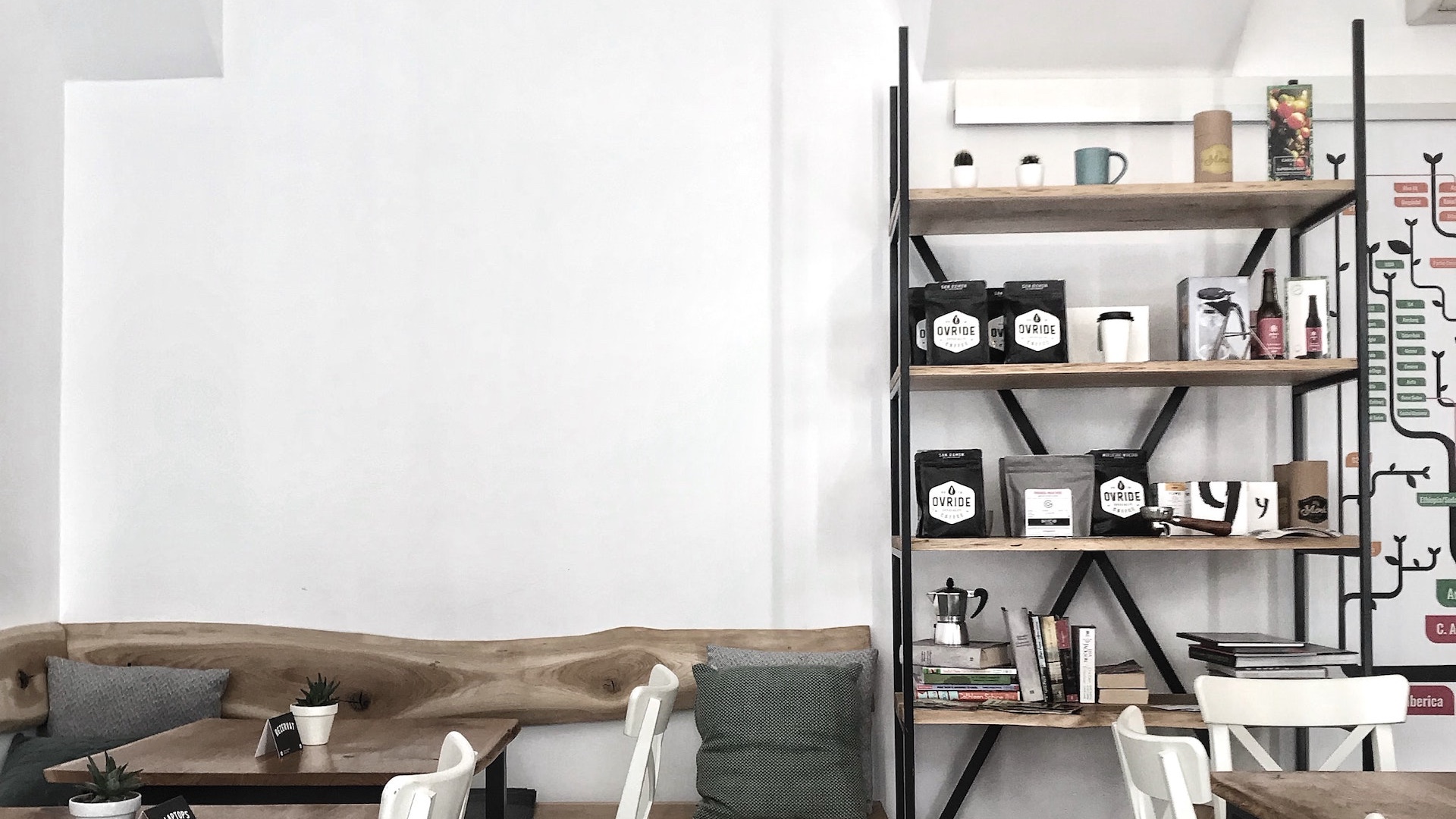 白い壁とシェルフのあるカフェ