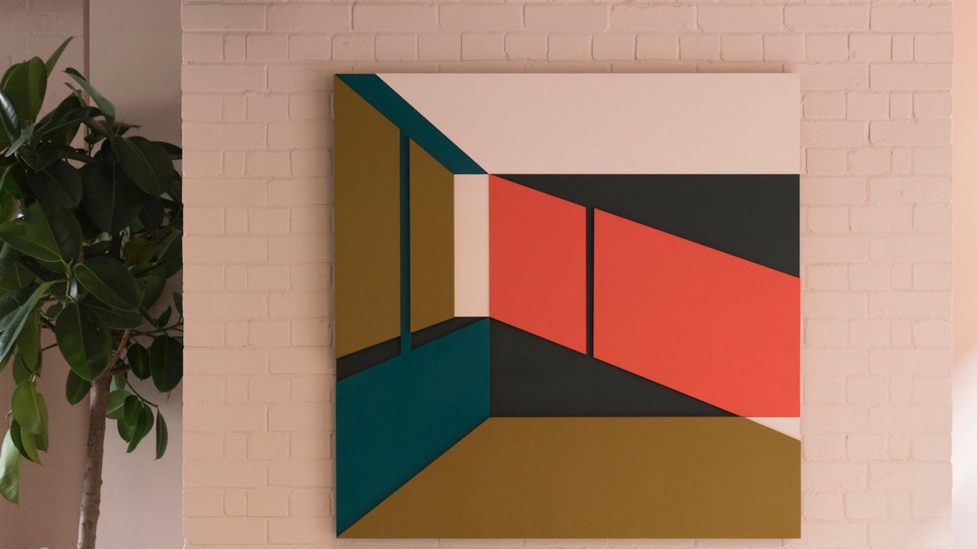 大きなアートと観葉植物のある壁